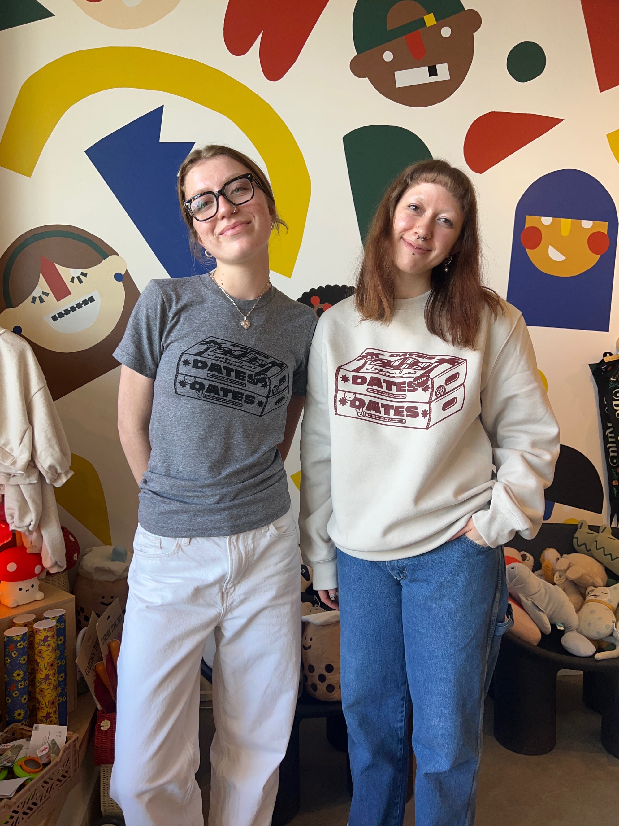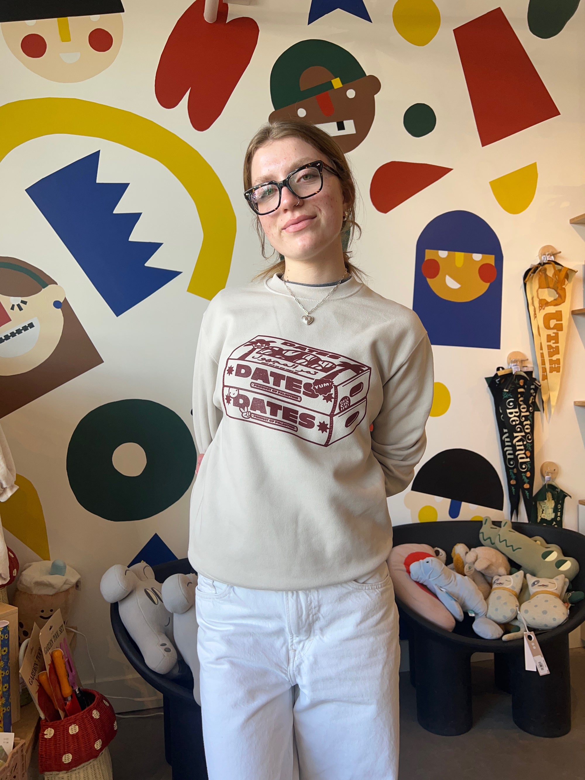 Beige sweater with maroon screen sprint of two boxes of dates with the words Dates, Yum, Made in Palestine on the boxes.