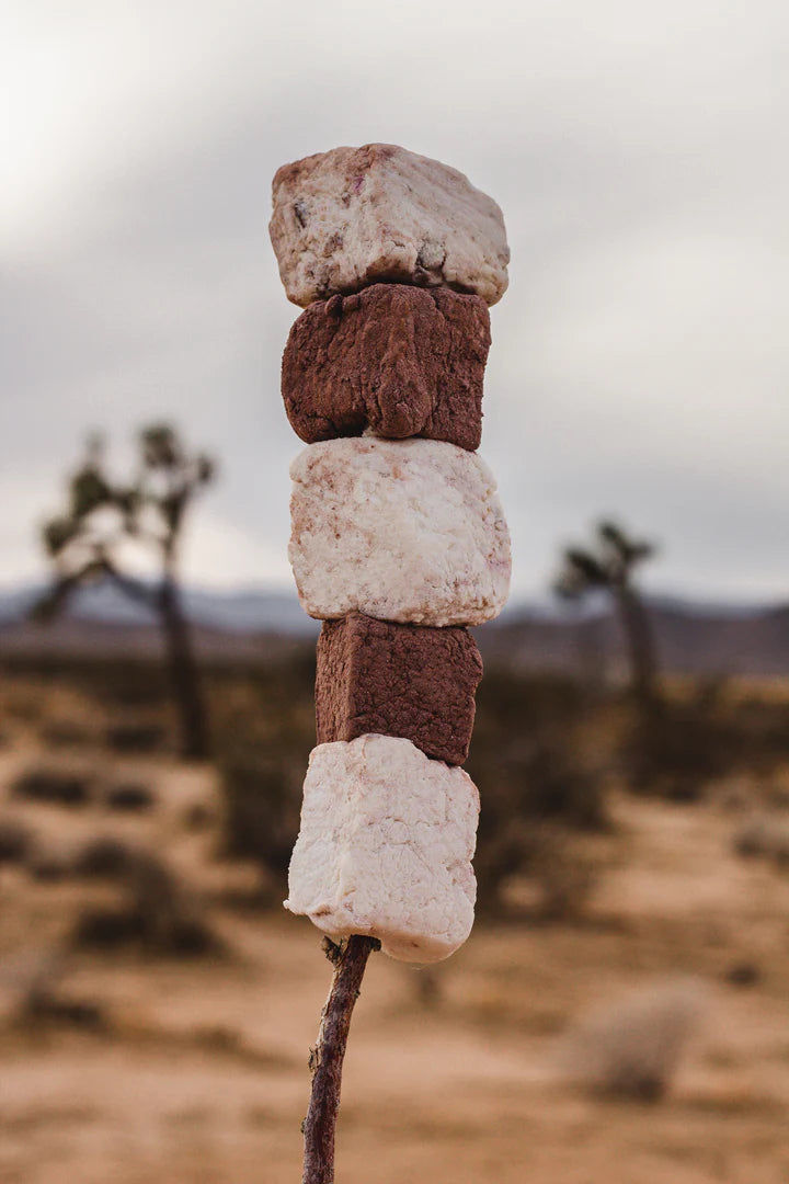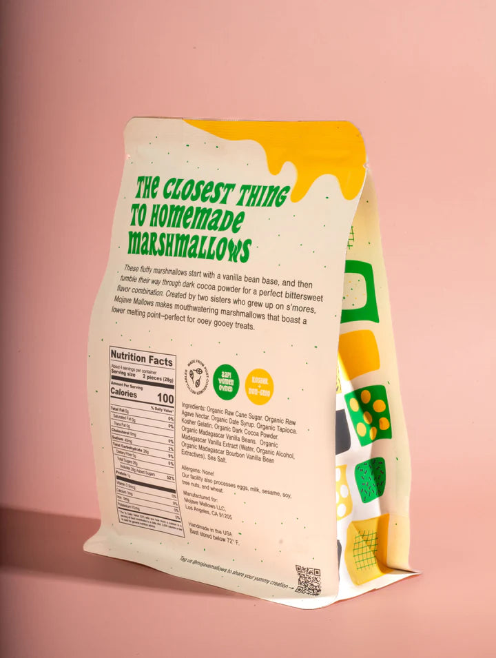 Colorful chocolate bar packaging featuring bold geometric designs. An illustrated s'more with a campfire is central, with a bear and trees below. Text reads "Cabin S'mores" and "Milk Chocolate Truffle Bar." The style is playful and nostalgic.