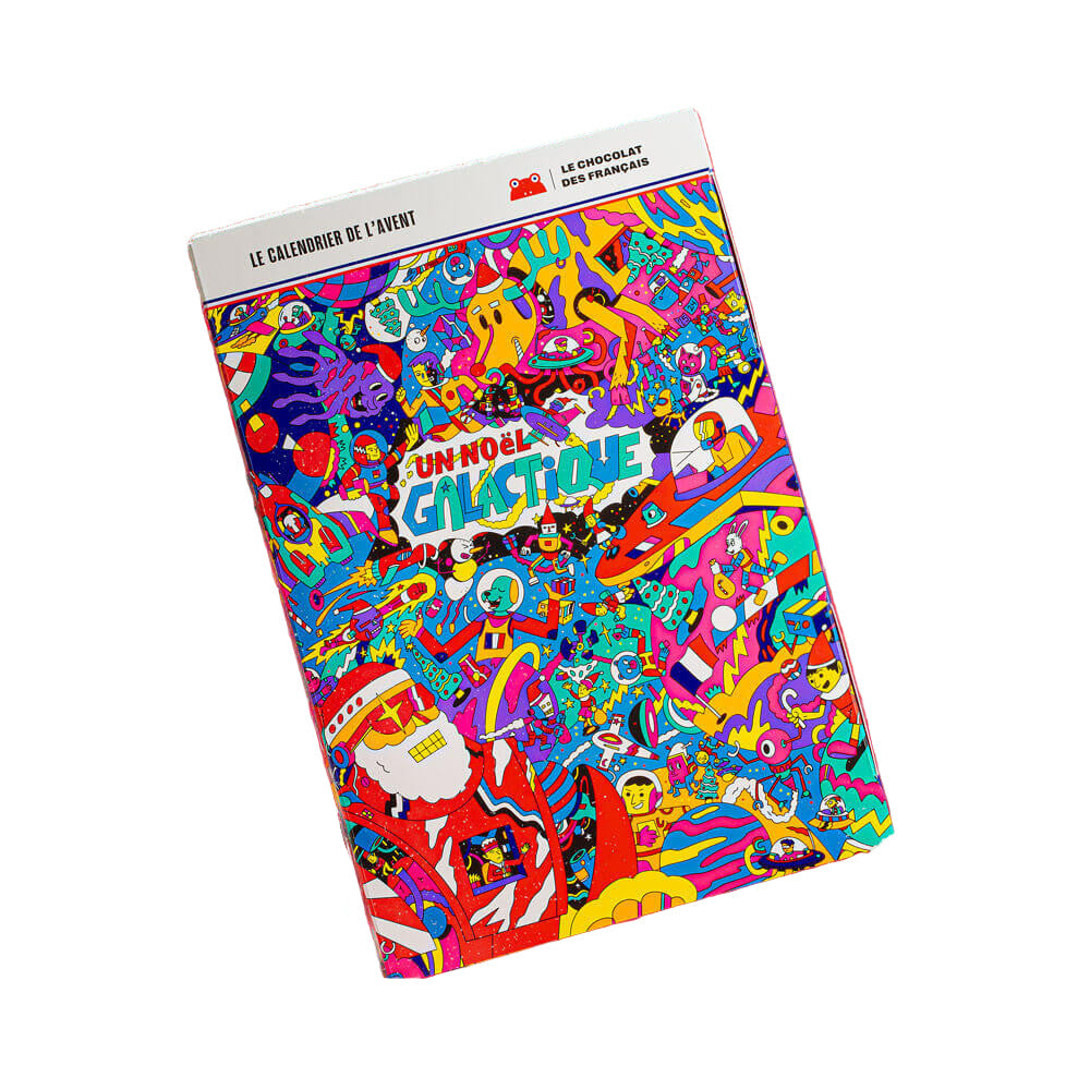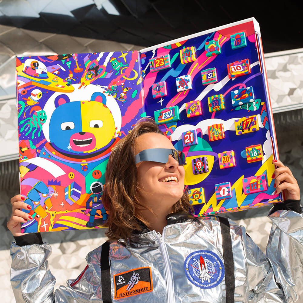 Advent calendar with a colorful illustration of a festive building, each window depicting joyful holiday scenes with characters, decorations, and a vibrant, cheerful atmosphere.