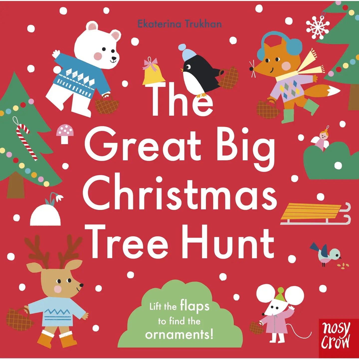 Red candy wrapper with festive illustrations of people decorating a Christmas tree. Text reads "Candy Cane Dark Chocolate Truffle Bar" by Seattle Chocolate.