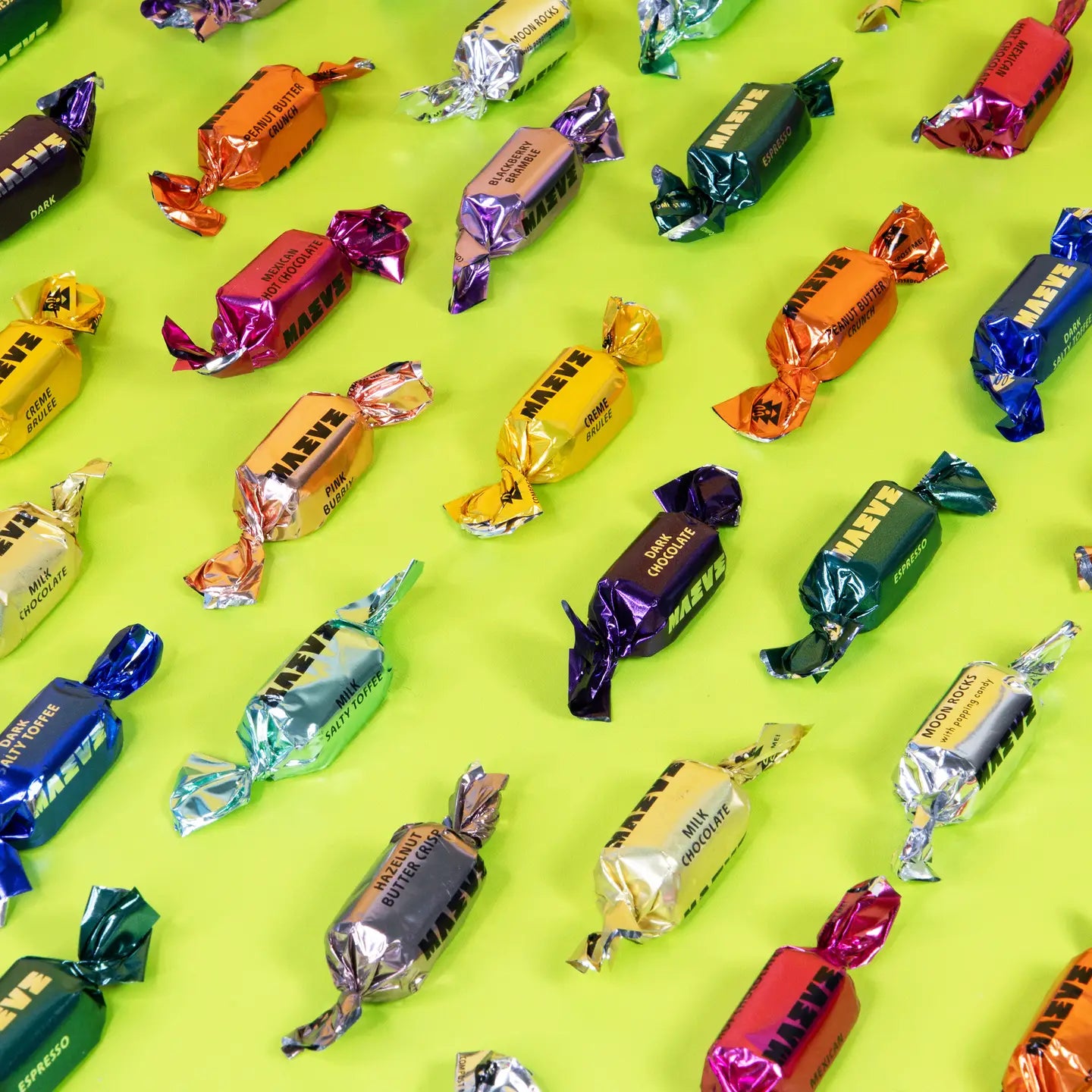 Colorful chocolate bar packaging featuring bold geometric designs. An illustrated s'more with a campfire is central, with a bear and trees below. Text reads "Cabin S'mores" and "Milk Chocolate Truffle Bar." The style is playful and nostalgic.