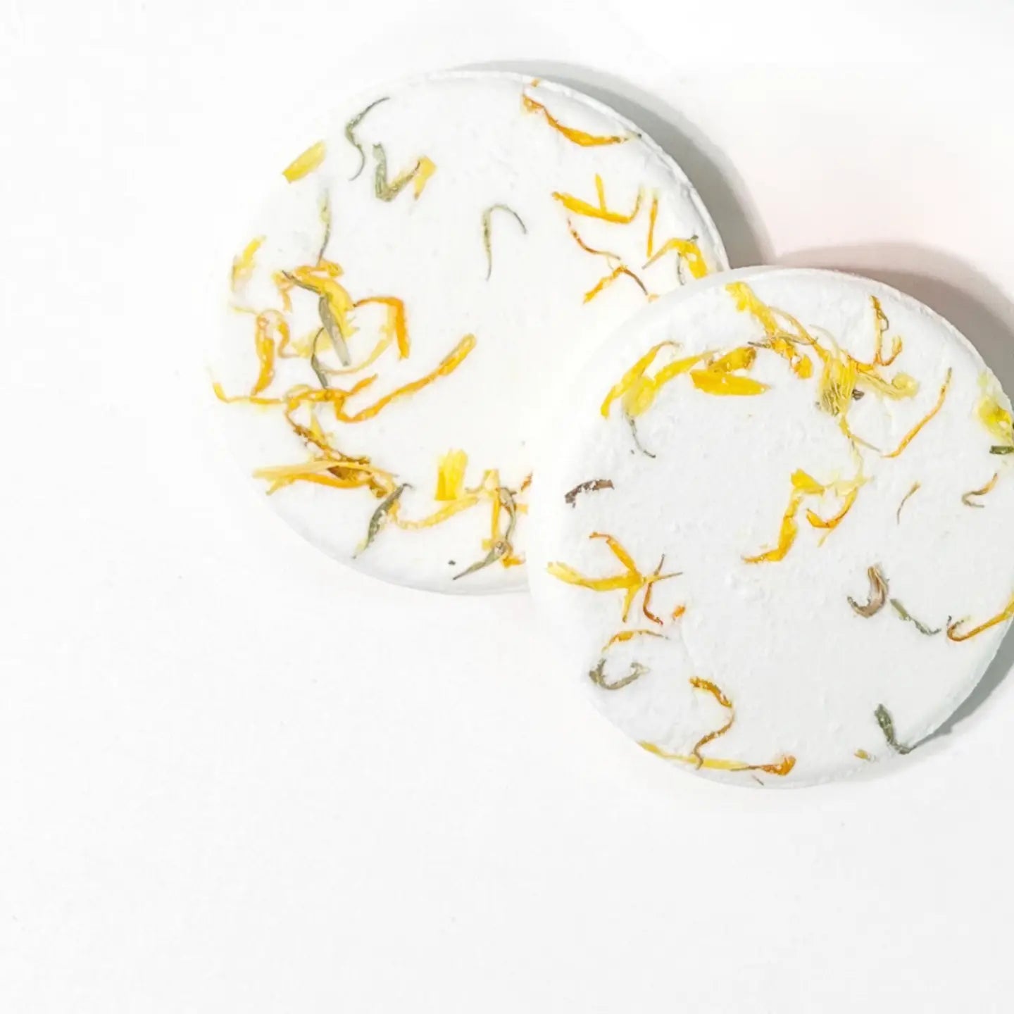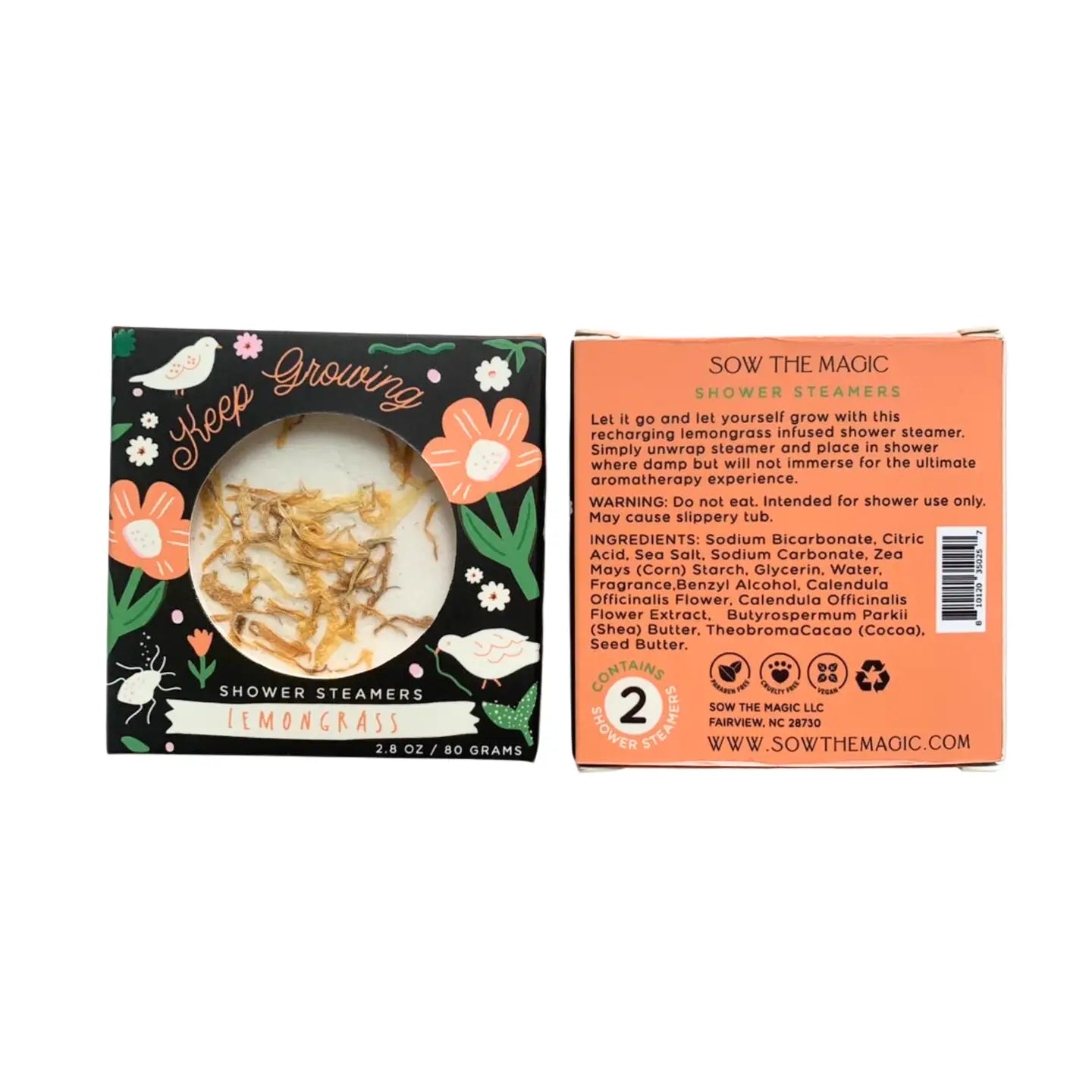 Shower steamers with lemongrass scent in a decorative box on a white background
