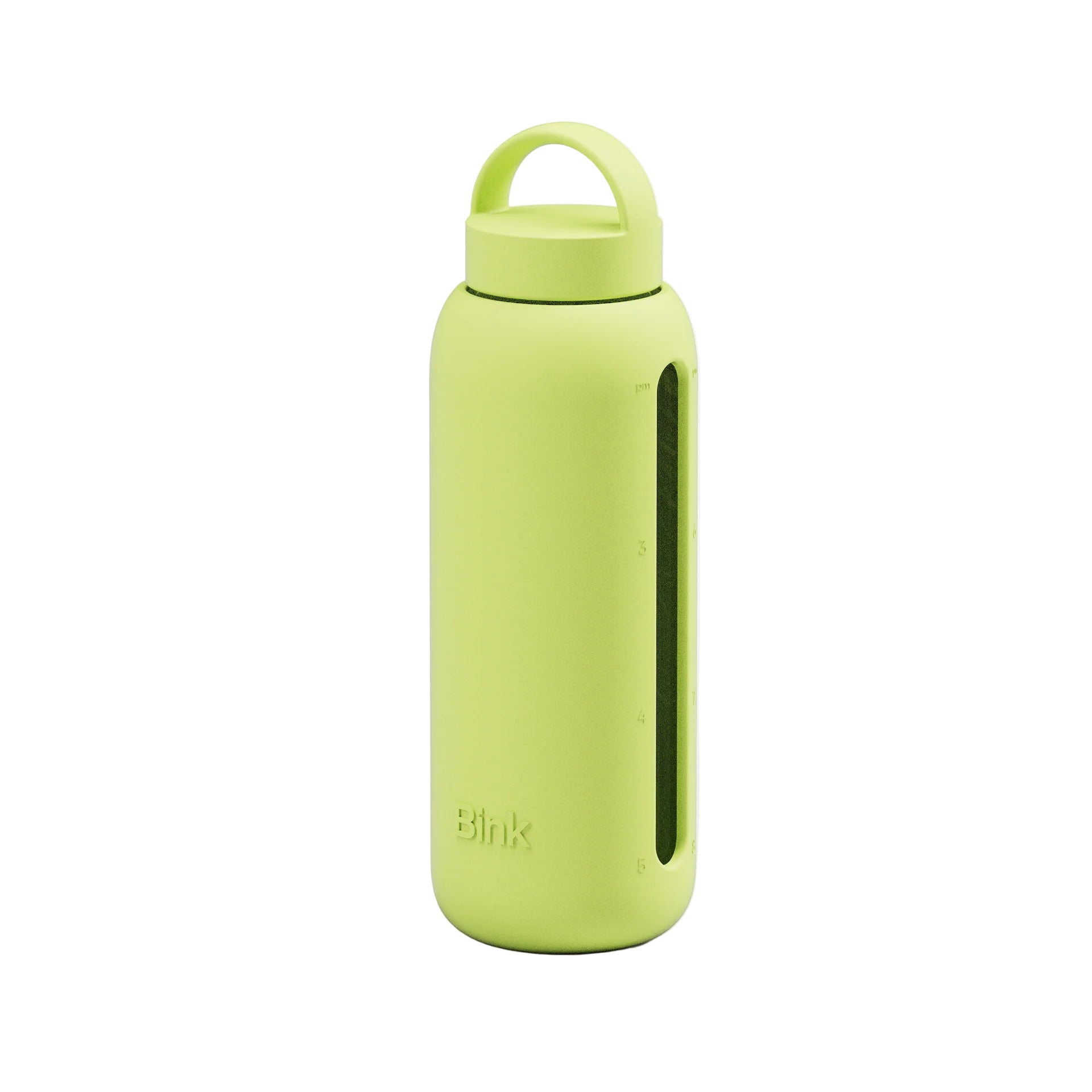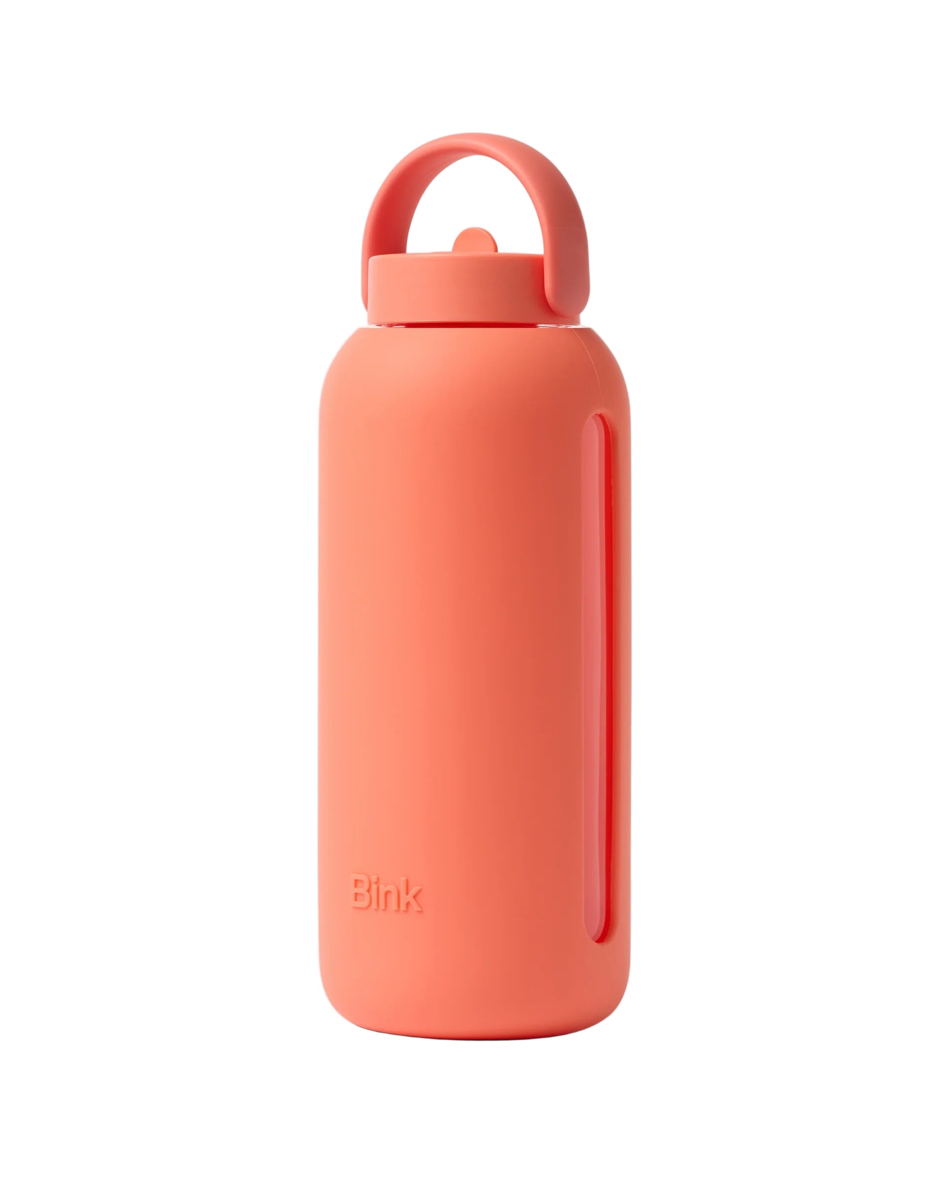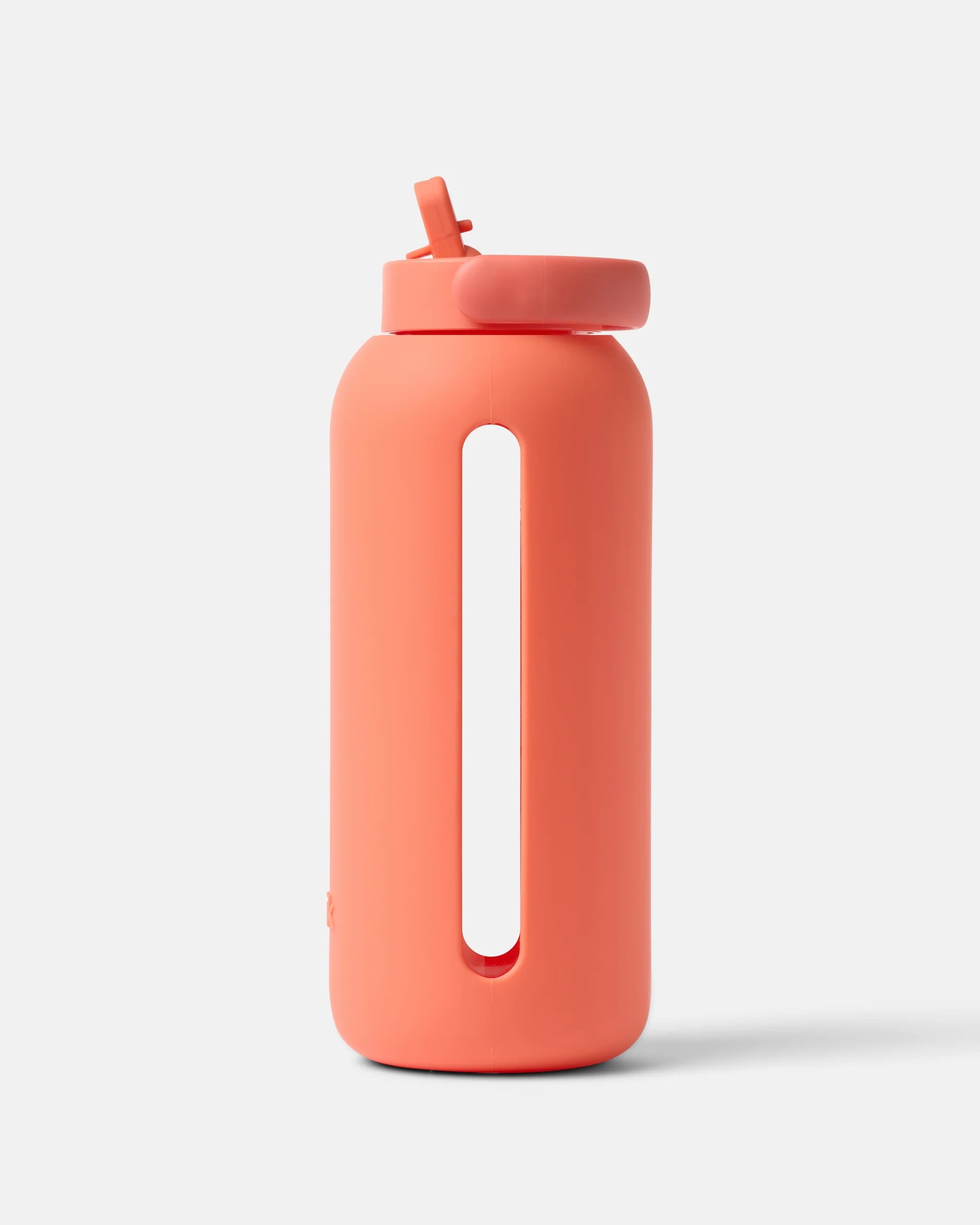 Glass water bottle with a protective silicone sleeve and screw on cap in navy.