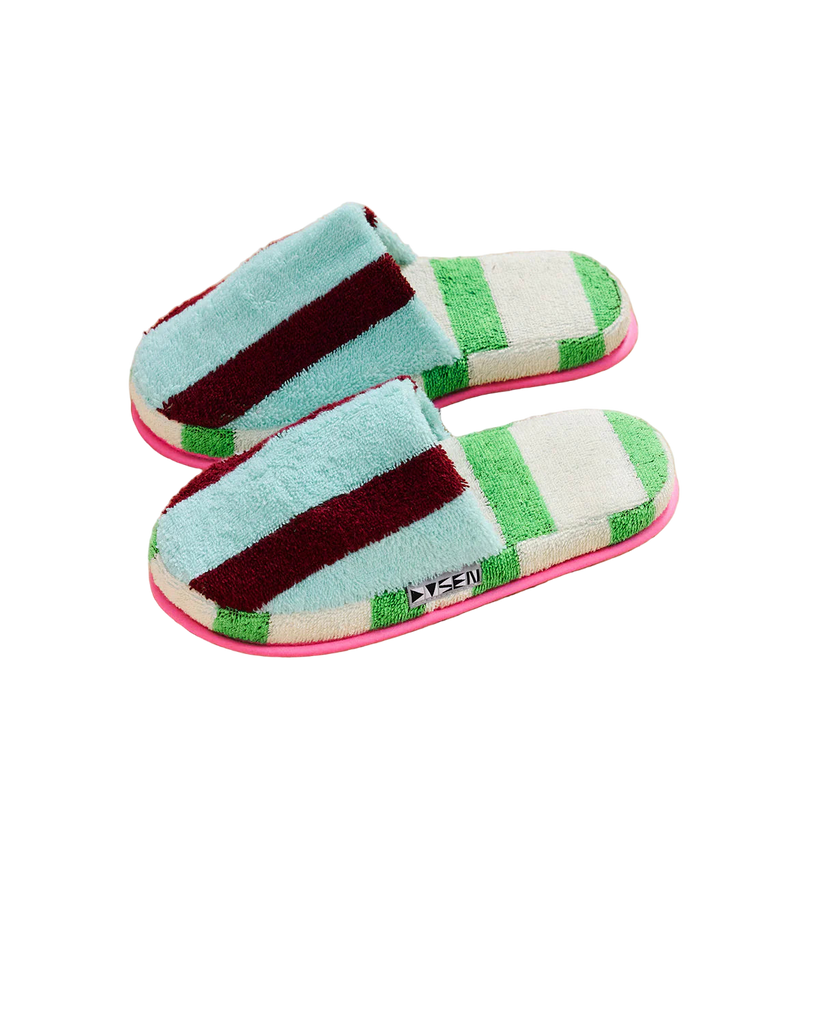 430 GSM, 95% Cotton & 5% Polyamide. Sole is foam-filled with a PVC base.