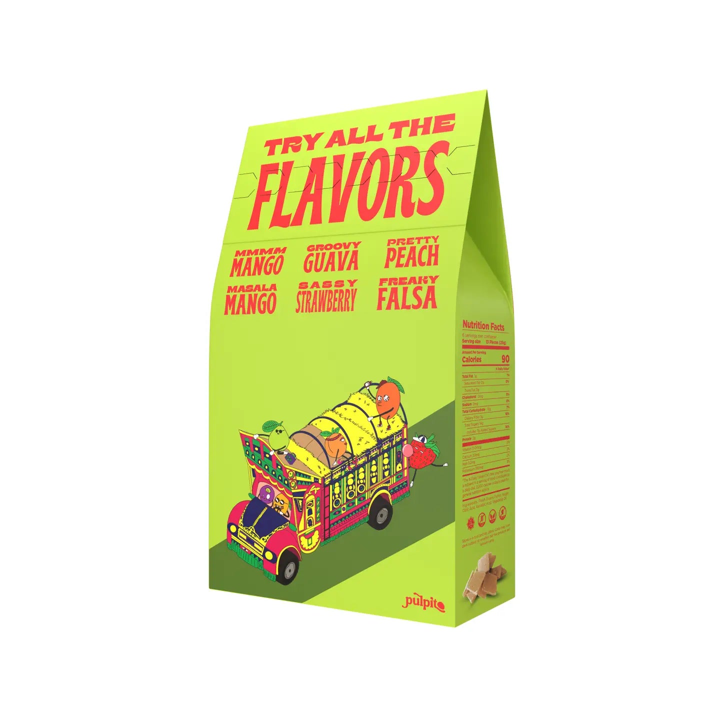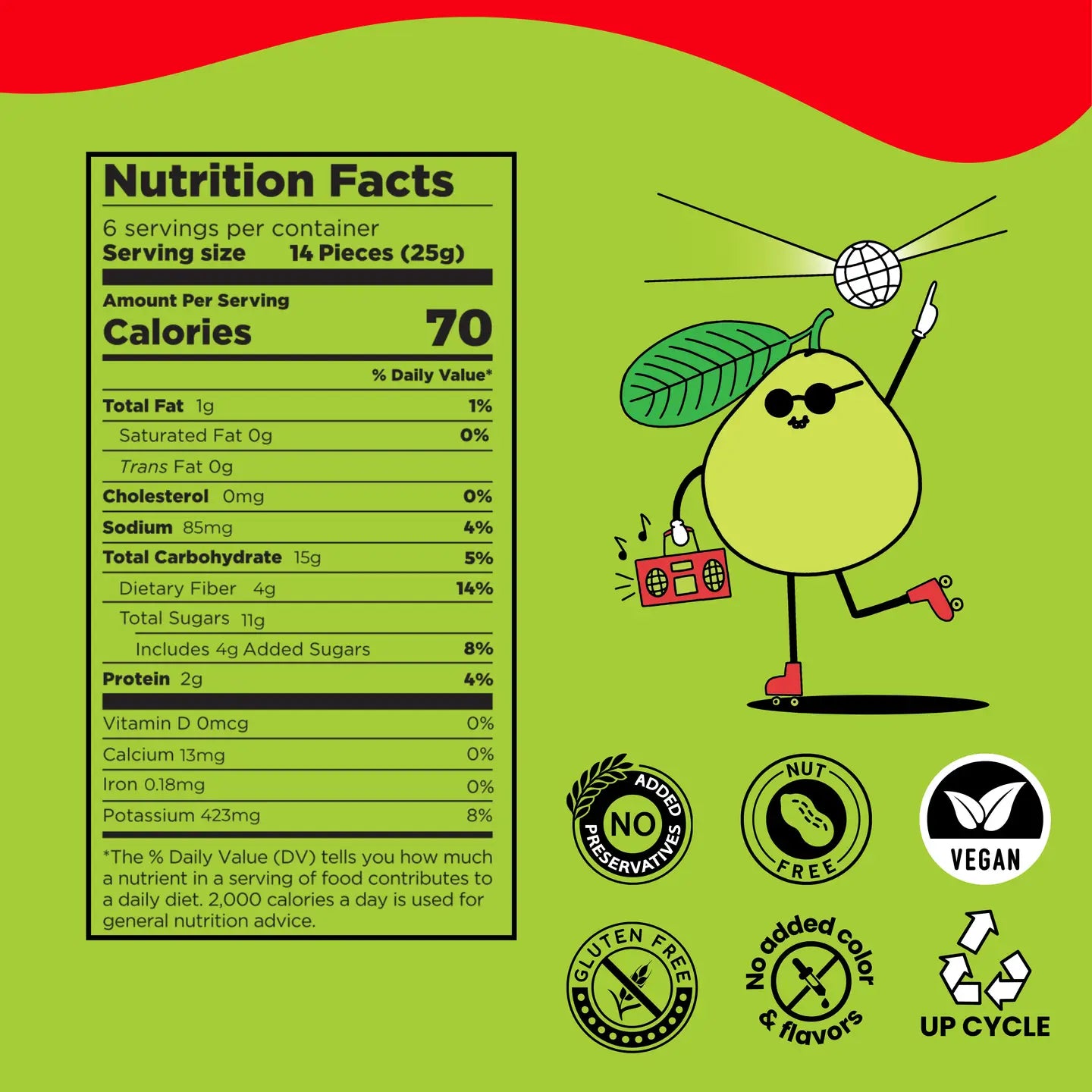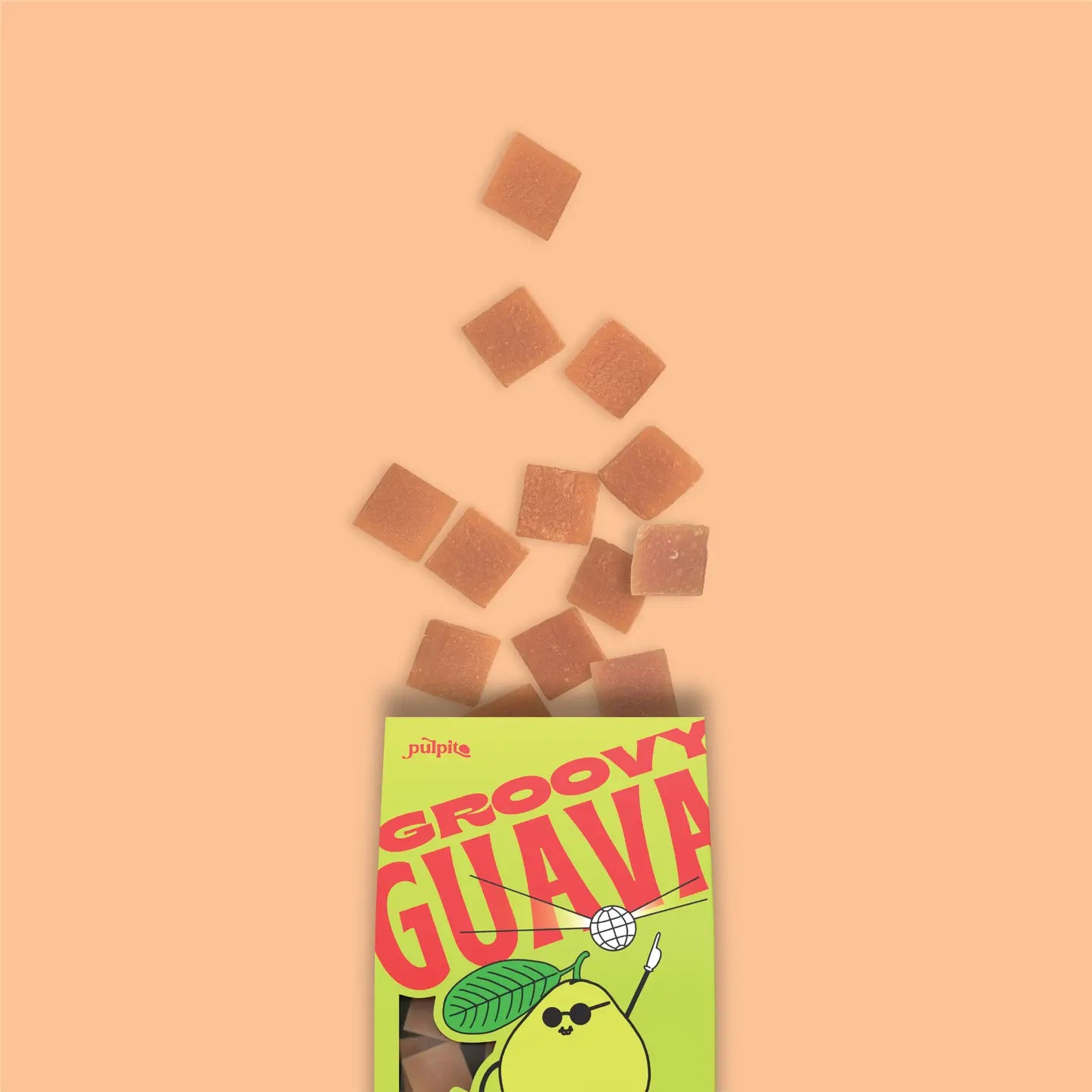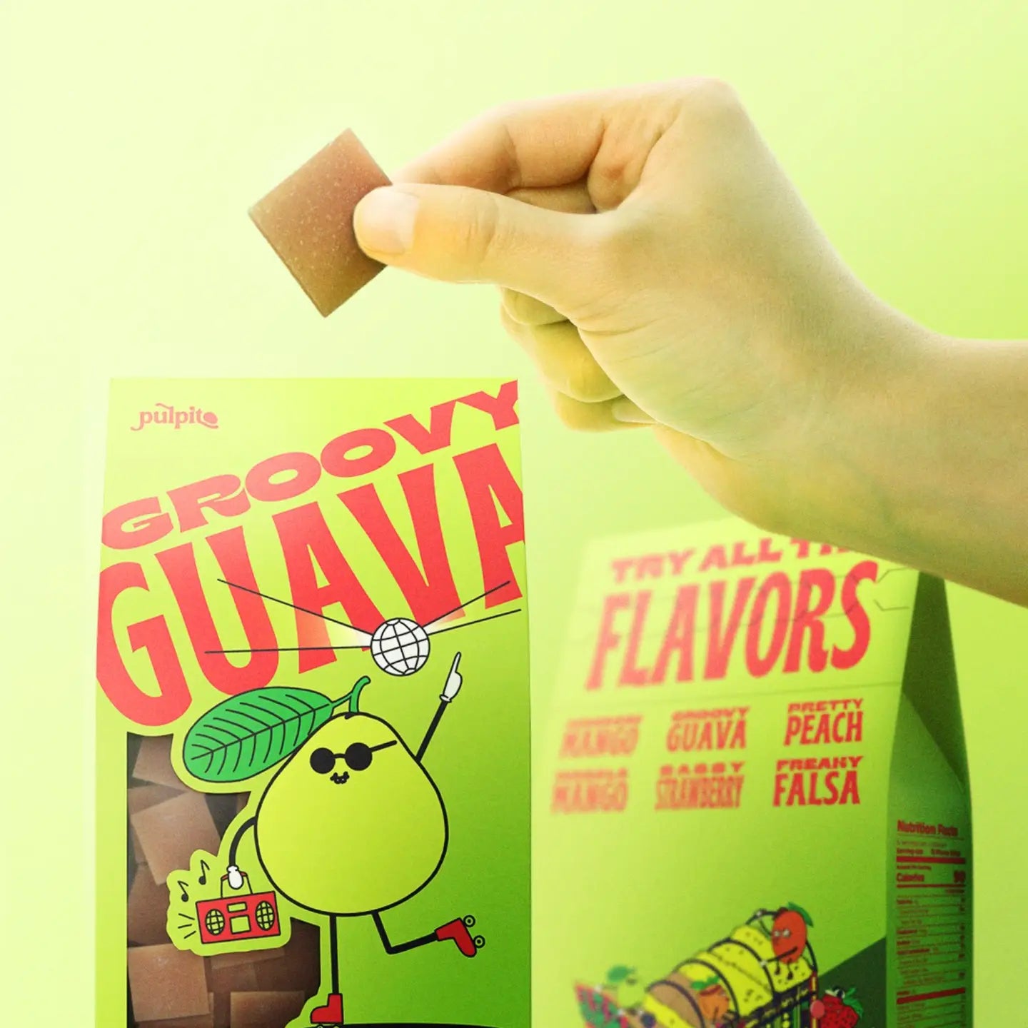 Bright green box with "Groovy Guava" in bold red. Cartoon guava wearing sunglasses and roller skates, holding a boombox, conveys fun and playful vibes.