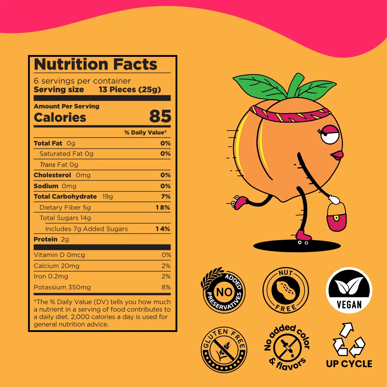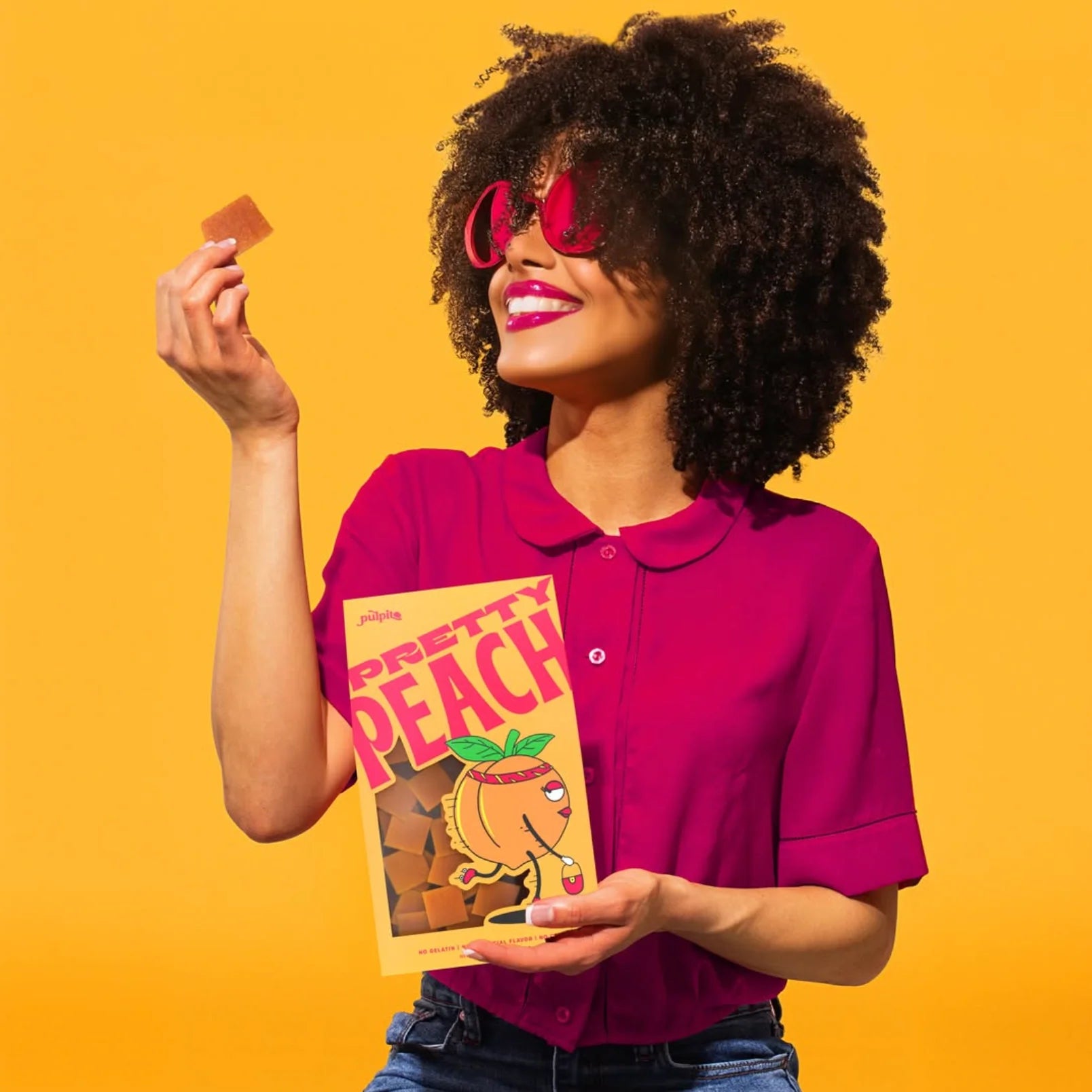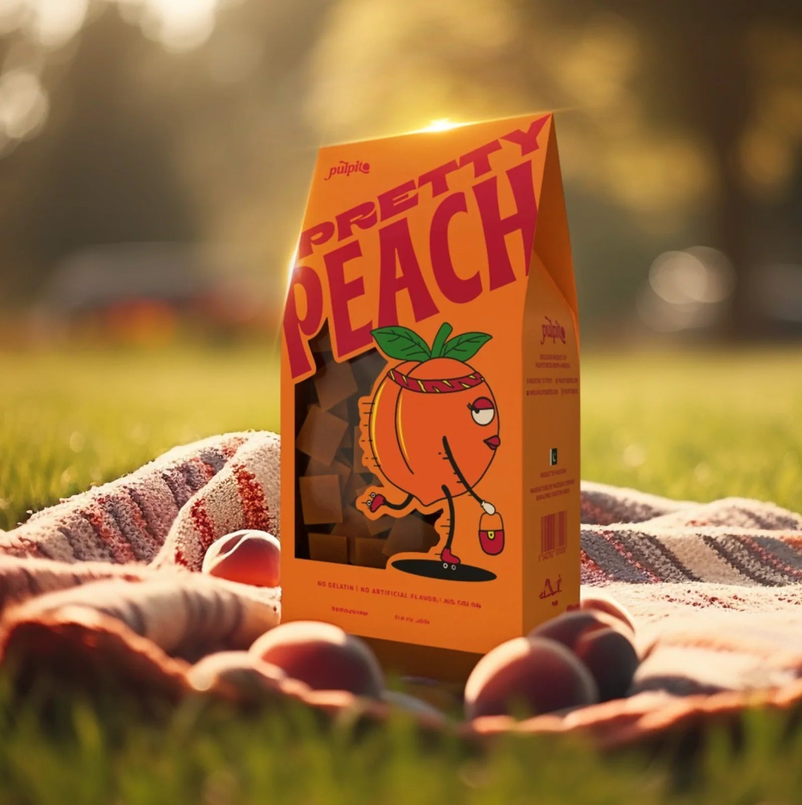 Stylish package featuring cartoon peach character on skates with a purse. Bold text reads "Pretty Peach." Bright, playful tone with peach treats visible.