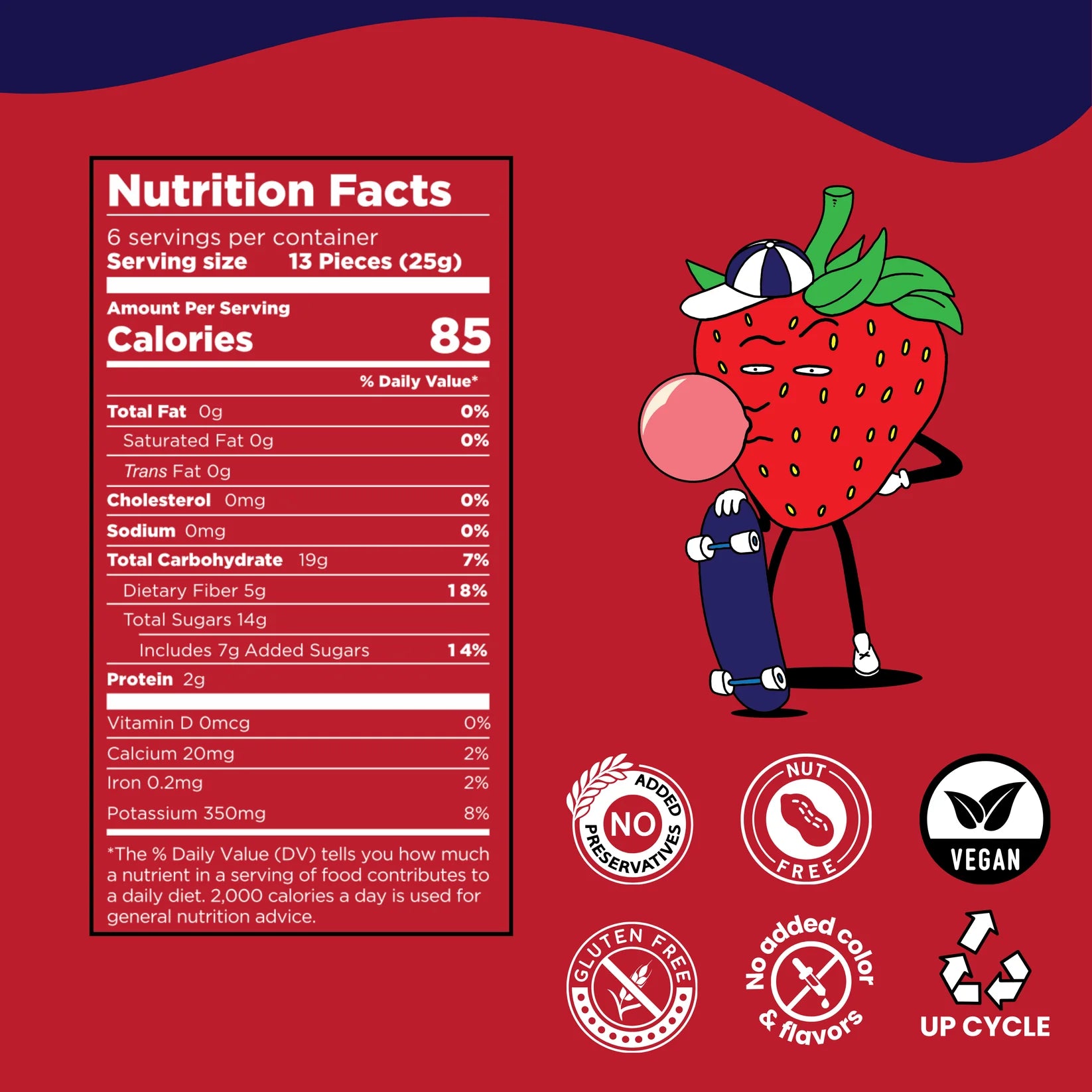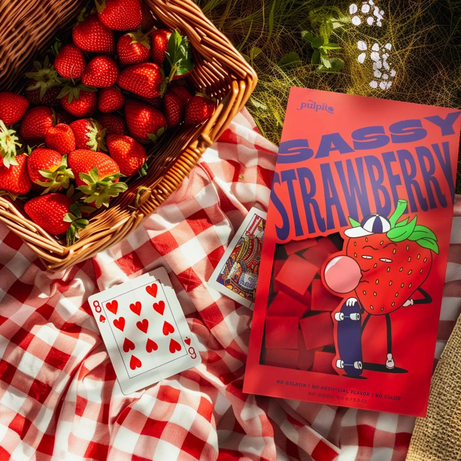 Red candy packaging with "Sassy Strawberry" text. Features a cartoon strawberry blowing bubblegum, wearing sneakers and a cap, holding a skateboard.