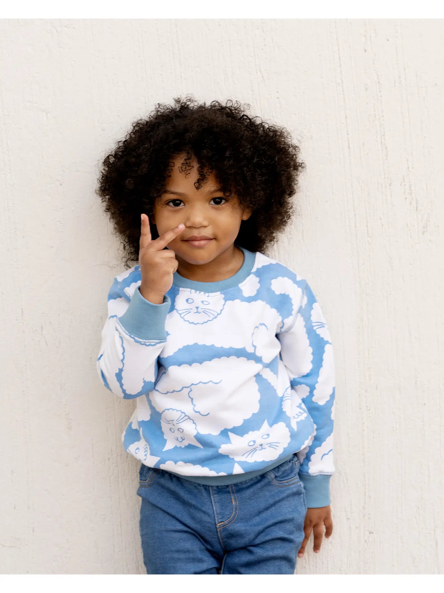 Blue sweater with white cat cloud pattern on a white background
