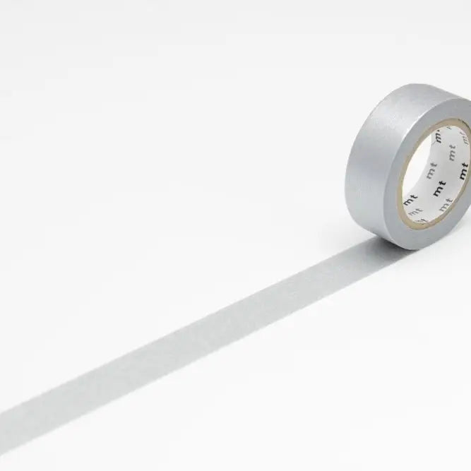 Roll of silver tape with 'mt' branding on a white background