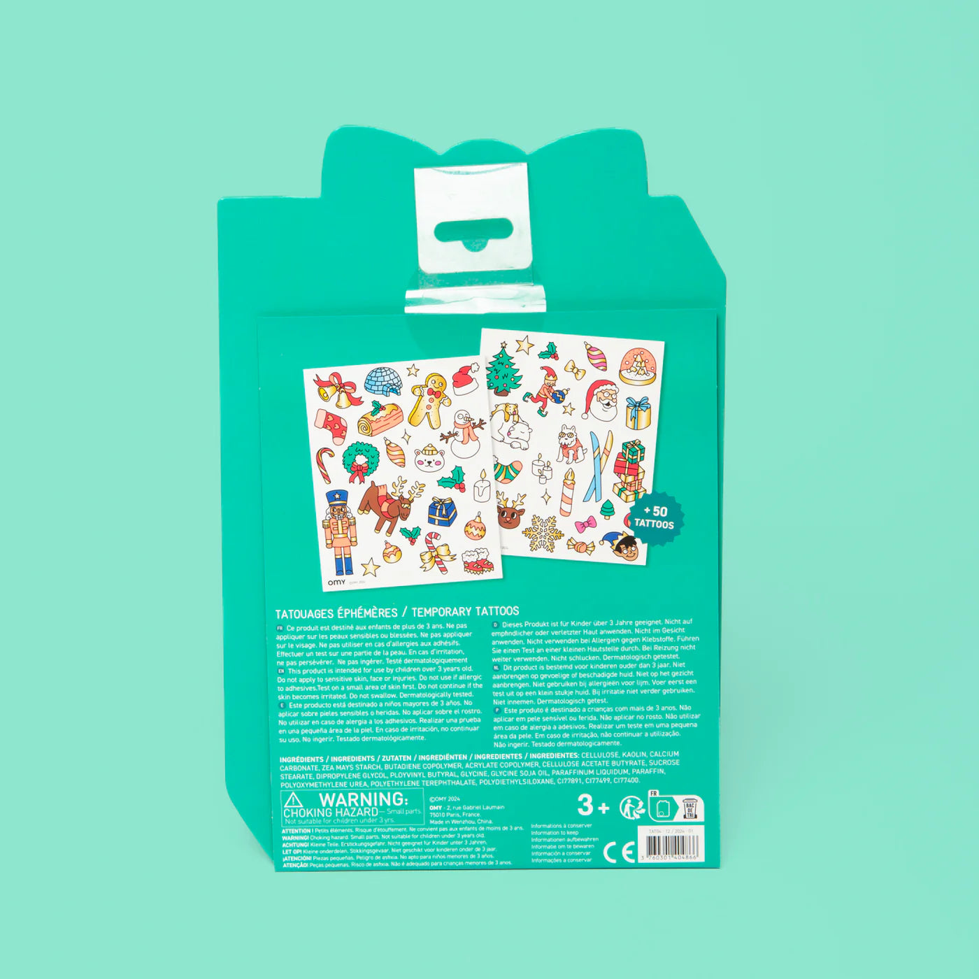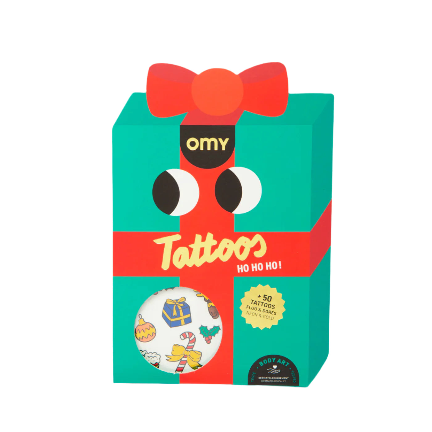 Packaging of OMY Ho Ho Ho! face stickers with a Christmas tree design.