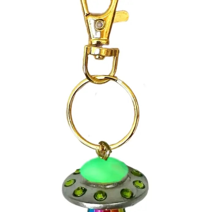 Colorful keychain of a green cartoon character book with its hands on its hip and a toothy smile