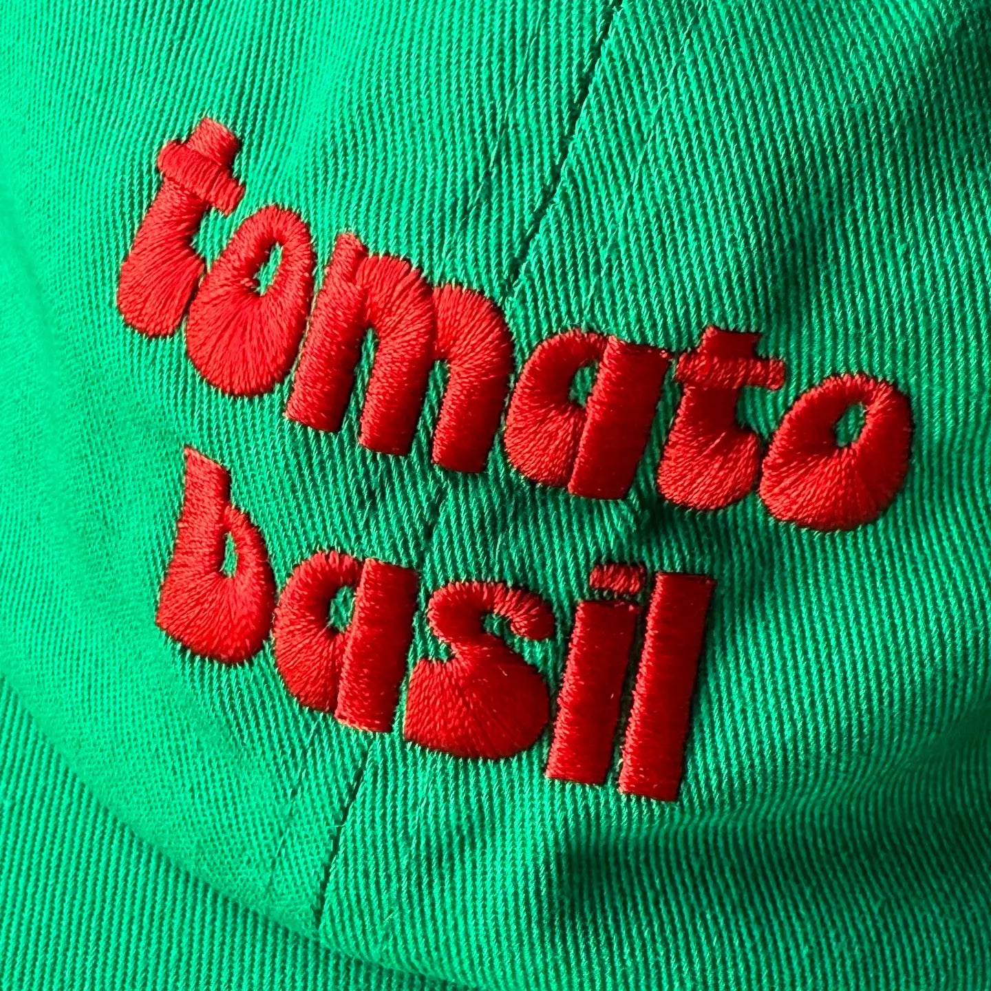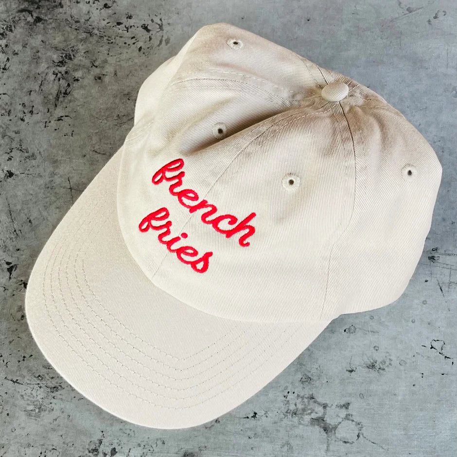 Beige hat with FRENCH FRIES embroidered in red on front.