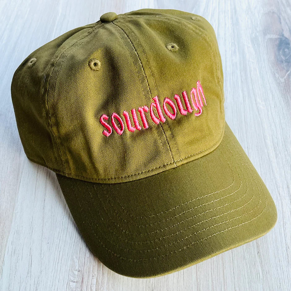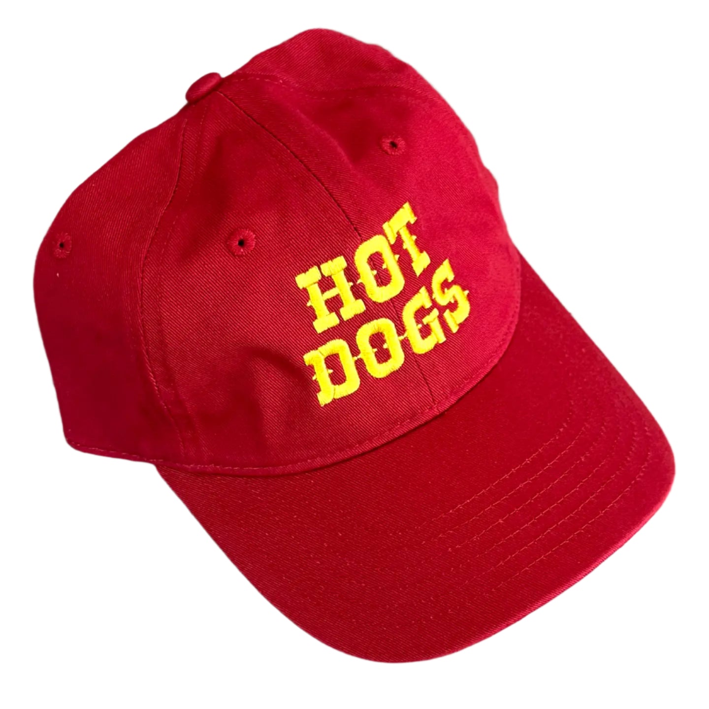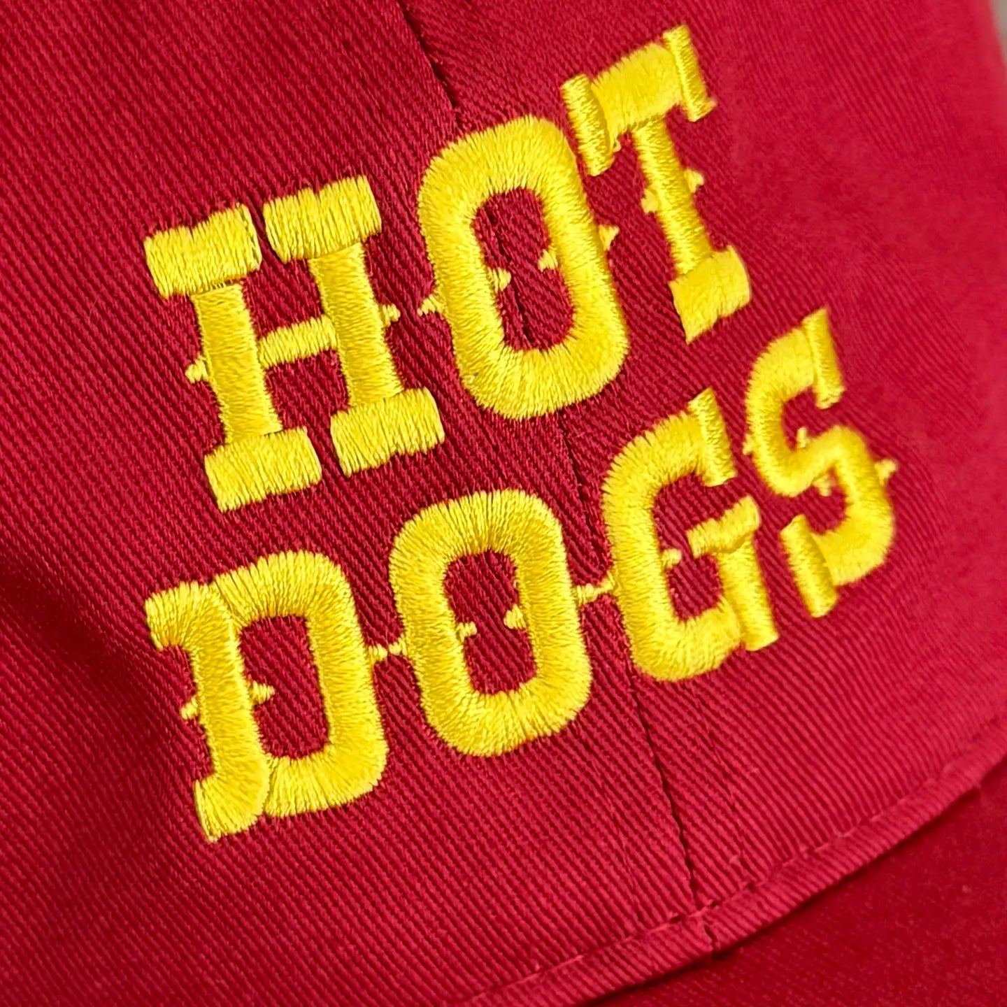 Yellow hat with DEVILED EGGS embroidered on front in red.
