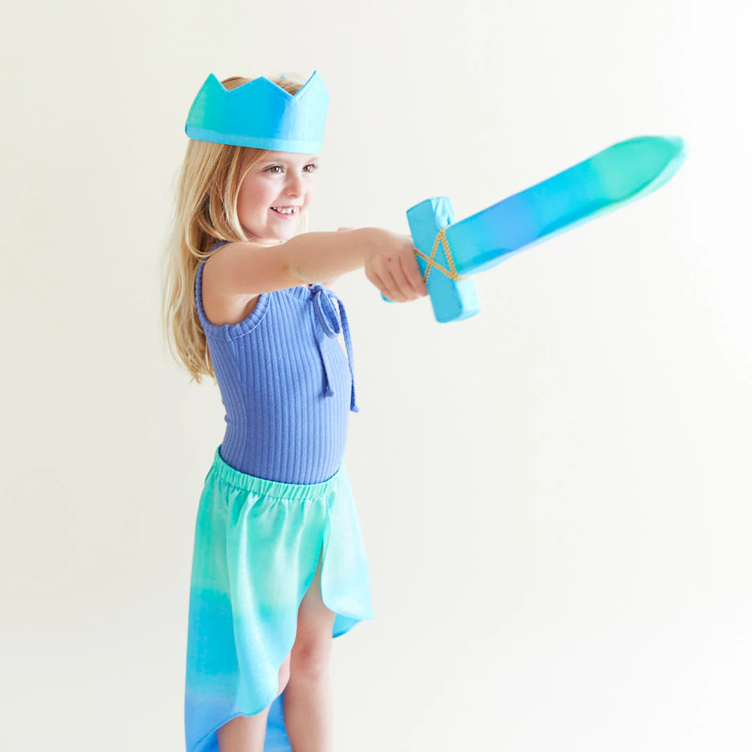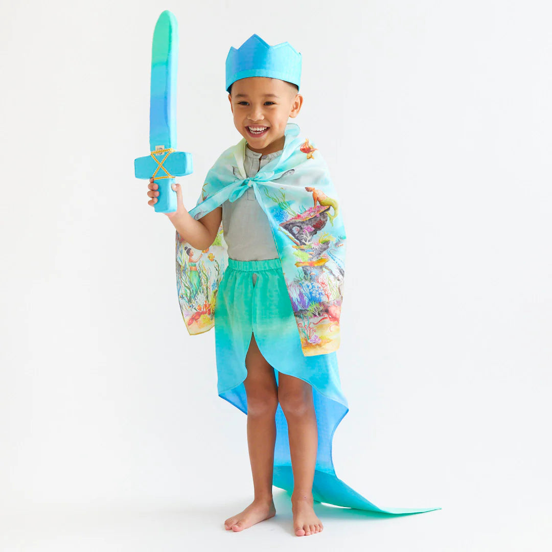 Blue fabric with celestial patterns and a folded packaging on a white background